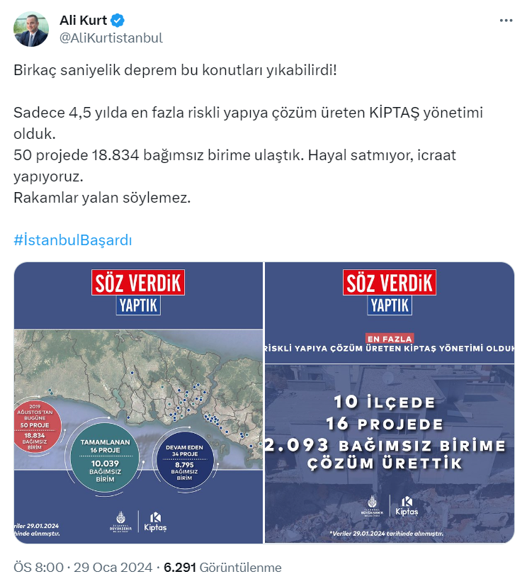 Ali Kurt resmi X hesabı https://twitter.com/AliKurtistanbul üzerinden yaptığı paylaşımında 50 projede 18 bin 834 bağımsız birime ulaştıklarını belirterek, "Hayal satmıyor, icraat yapıyoruz. Rakamlar yalan söylemez." dedi.