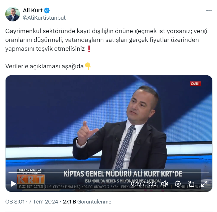 KİPTAŞ Genel Müdürü Ali Kurt resmi sosyal medya hesabı https://x.com/AliKurtistanbul üzerinden yaptığı paylaşımda gayrimenkul sektöründe kayıt dışılığın önüne geçmenin formülünü açıkladı.