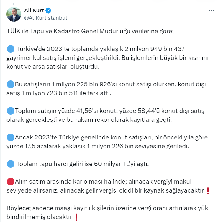 Gayrimenkul sektöründe vergi ve kira tartışmaları devam ederken, KİPTAŞ Genel Müdürü Ali Kurt'tan da çok konuşulacak bir paylaşım geldi.