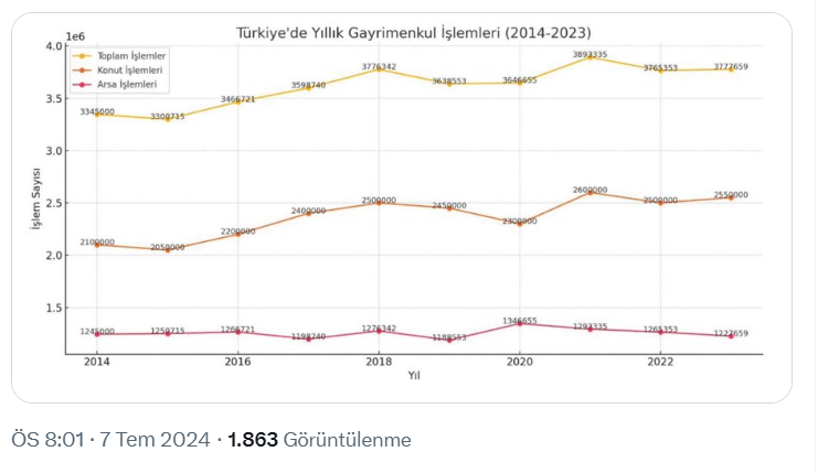 - Türkiye'de 2023’te toplamda yaklaşık 2 milyon 949 bin 437 gayrimenkul satış işlemi gerçekleştirildi. Bu işlemlerin büyük bir kısmını konut ve arsa satışları oluşturdu.