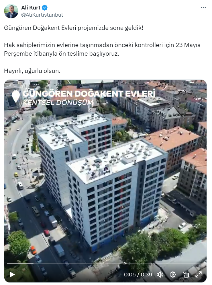 Ali Kurt açıklamasında "Güngören Doğakent Evleri projemizde sona geldik! Hak sahiplerimizin evlerine taşınmadan önceki kontrolleri için 23 Mayıs Perşembe itibarıyla ön teslime başlıyoruz. Hayırlı, uğurlu olsun." ifadelerini kullandı.