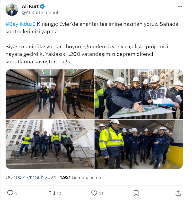 Beylikdüzü Kırlangıç Evler'de anahtar teslimine hazırlandıklarını ve sahada kontrollerini yaptıklarını söyleyen Ali Kurt resmi X hesabı https://twitter.com/AliKurtistanbul üzerinden yaptığı paylaşımında şu ifadeleri kullandı: "Siyasi manipülasyonlara boyun eğmeden özveriyle çalışıp projemizi hayata geçirdik. Yaklaşık 1.200 vatandaşımızı deprem dirençli konutlarına kavuşturacağız."