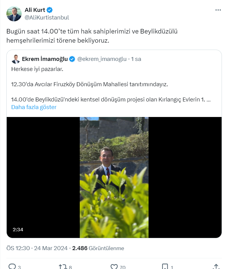 Beylikdüzü Gürpınar'da hayata geçirilen Kırlangıç Evler projesi ile ilgili olarak resmi X hesabı https://twitter.com/AliKurtistanbul üzerinden bir son dakika paylaşımı yapan KİPTAŞ Genel Müdürü Ali Kurt "Bugün saat 14.00’te tüm hak sahiplerimizi ve Beylikdüzülü hemşehrilerimizi törene bekliyoruz." ifadelerini kullandı.