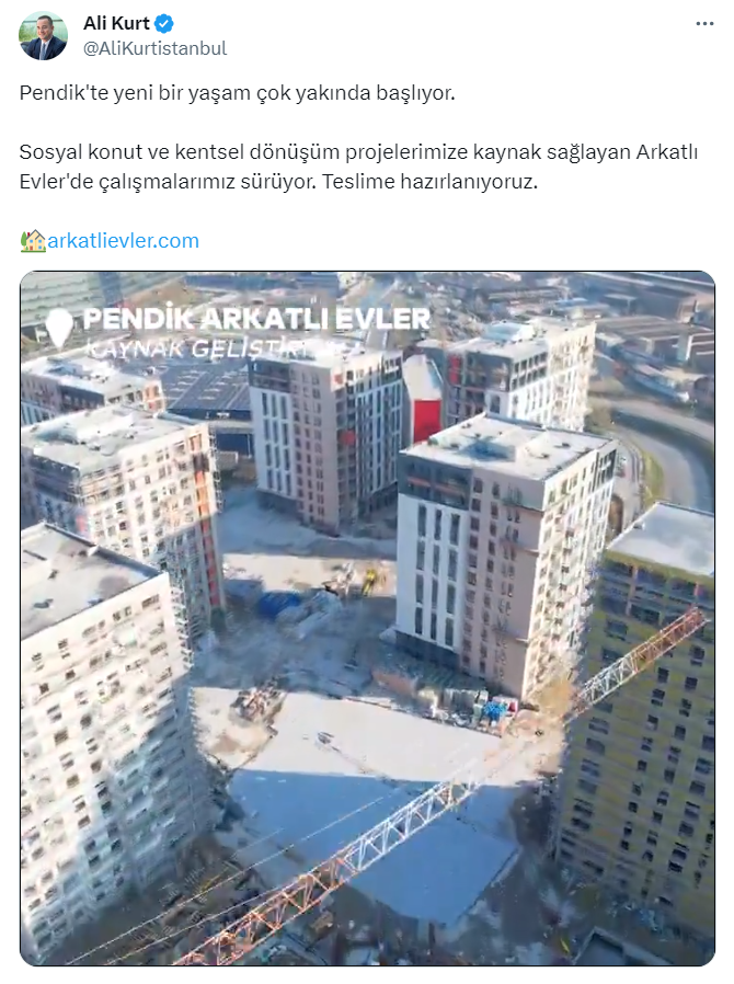 İstanbul Büyükşehir Belediyesi iştiraki KİPTAŞ imzası ile yükselen Pendik Arkatlı Evler teslime hazırlanıyor. İşte KİPTAŞ Genel Müdürü Ali Kurt'un o paylaşımı...