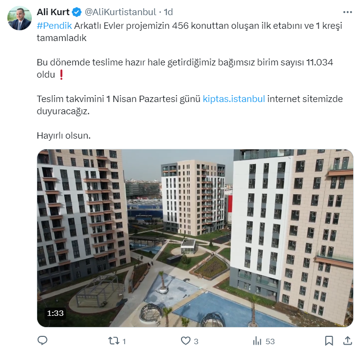 KİPTAŞ Genel Müdürü Ali Kurt resmi sosyal medya hesabı https://twitter.com/AliKurtistanbul üzerinden yaptığı paylaşımda Pendik Arkatlı Evler projemizin 456 konuttan oluşan ilk etabını ve 1 kreşi tamamladıklarını belirterek, "Bu dönemde teslime hazır hale getirdiğimiz bağımsız birim sayısı 11 bin 34 oldu. Teslim takvimini 1 Nisan Pazartesi günü http://kiptas.istanbul internet sitemizde duyuracağız. Hayırlı olsun." ifadelerini kullandı.