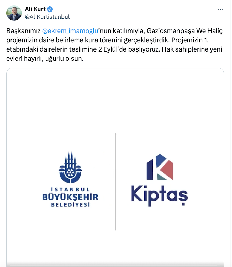 KİPTAŞ Genel Müdürü Ali Kurt'un paylaşımı şu şekilde: