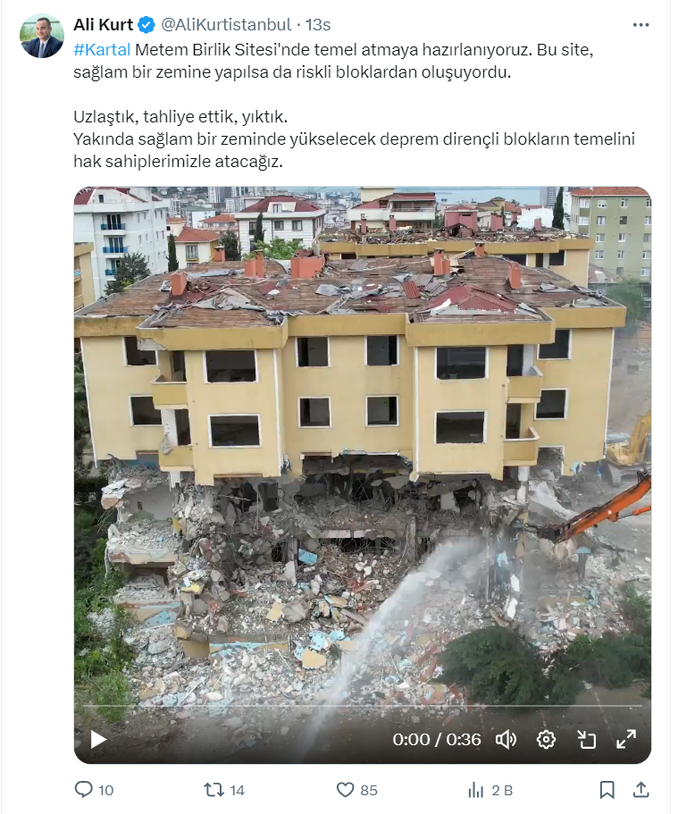 KİPTAŞ Genel Müdürü Ali Kurt resmi X hesabı https://twitter.com/AliKurtistanbul üzerinden yaptığı açıklamada Kartal Metem Birlik Sitesi'nde temel atmaya hazırlandıklarını belirterek, "Kartal Metem Birlik Sitesi'nde temel atmaya hazırlanıyoruz. Bu site, sağlam bir zemine yapılsa da riskli bloklardan oluşuyordu. Uzlaştık, tahliye ettik, yıktık.