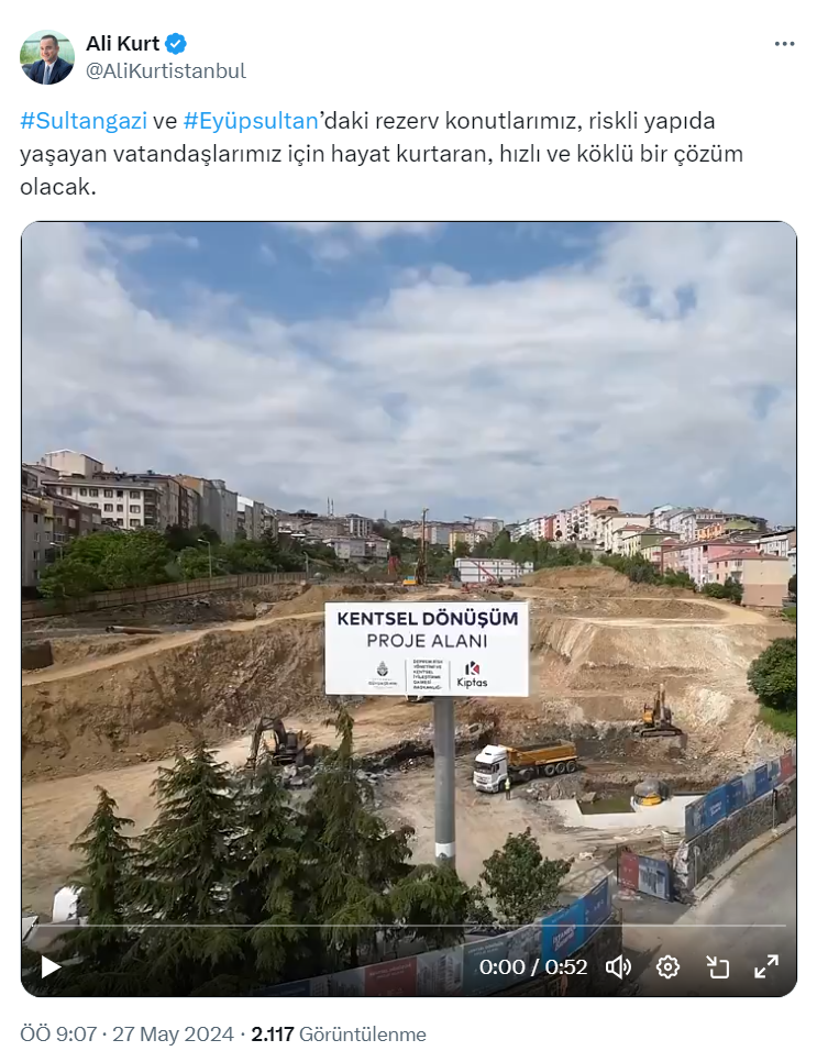 KİPTAŞ Genel Müdürü Ali Kurt, resmi X hesabı https://x.com/AliKurtistanbul/ üzerinden yaptığı paylaşımda "Sultangazi ve Eyüpsultan’daki rezerv konutlarımız, riskli yapıda yaşayan vatandaşlarımız için hayat kurtaran, hızlı ve köklü bir çözüm olacak." dedi.