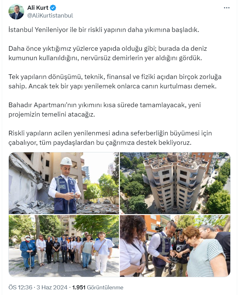 Ali Kurt resmi X hesabı https://x.com/AliKurtistanbul üzerinden yaptığı paylaşımda "Bahadır Apartmanı'nın yıkımını kısa sürede tamamlayacak, yeni projemizin temelini atacağız. Riskli yapıların acilen yenilenmesi adına seferberliğin büyümesi için çabalıyor, tüm paydaşlardan bu çağrımıza destek bekliyoruz." ifadelerini kullandı