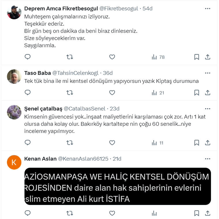 Söz konusu proje ile ilgili olarak bir paylaşım yapan KİPTAŞ Genel Müdürü Ali Kurt, "İstanbul Yenileniyor ile bir riskli yapının daha yıkımına başladık. "Daha önce yıktığımız yüzlerce yapıda olduğu gibi; burada da deniz kumunun kullanıldığını, nervürsüz demirlerin yer aldığını gördük. Tek yapıların dönüşümü, teknik, finansal ve fiziki açıdan birçok zorluğa sahip. Ancak tek bir yapı yenilemek onlarca canın kurtulması demek." dedi.