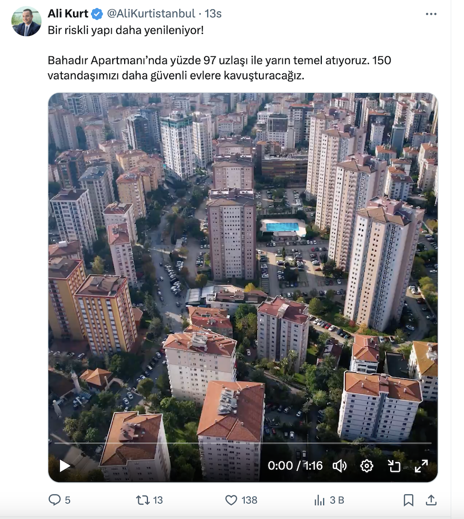 KİPTAŞ Genel Müdürü Ali Kurt resmi X hesabı https://twitter.com/AliKurtistanbul üzerinden yaptığı açıklamada Bahadır Apartmanı’nda yüzde 97 uzlaşı temel atacaklarını belirterek, “150 vatandaşımızı daha güvenli evlere kavuşturacağız.” ifadelerini kullandı.
