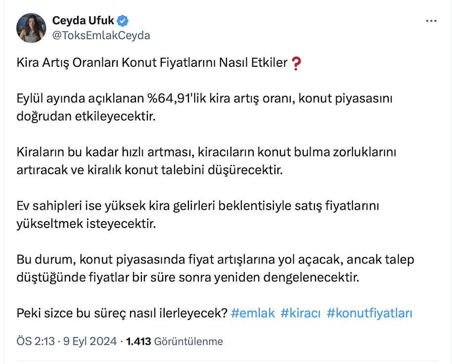 Ceyda Ufuk paylaşımında kiraların bu kadar hızlı artmasının kiracıların konut bulma zorluklarını artıracağını ve kiralık konut talebini düşüreceğini belirterek, “Ev sahipleri ise yüksek kira gelirleri beklentisiyle satış fiyatlarını yükseltmek isteyecektir.” İfadelerini kullandı.