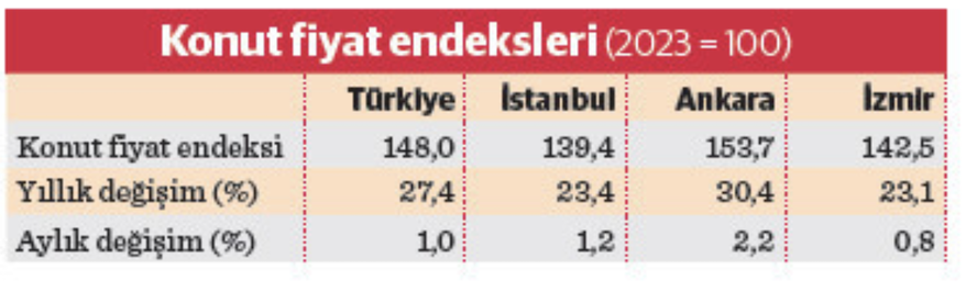 Konut birim fiyatlarına bakıldığı zaman Türkiye Cumhuriyet Merkez Bankası verilerine göre 2024 yılının 3. çeyreği sonu itibarıyla ülke genelinde metrekare fiyatı 33,9 bin Türk Lirası, İstanbul genelinde 52 bin Türk Lirası, İzmir’de 38,2 bin Türk Lirası ve başkent Ankara’da 27,9 bin Türk Lirası şeklinde oldu. 2021’in aynı dönemine baktığımız zaman Türkiye genelinde metrekare fiyatları 5,9 bin Türk Lirası, İstanbul’da 9,9 bin Türk Lirası, İzmir’de 6,4 bin Türk Lirası ve Ankara’da 4,2 bin Türk Lirası şeklindeydi. Buna göre geçen üç senelik dönemde ülke genelinde fiyatlar yüzde 471 oranında, mega kent İstanbul’da yüzde 425 oranında, İzmir’de yüzde 491 oranında ve başkent Ankara’da da yüzde 555 oranında artış gösterdi.