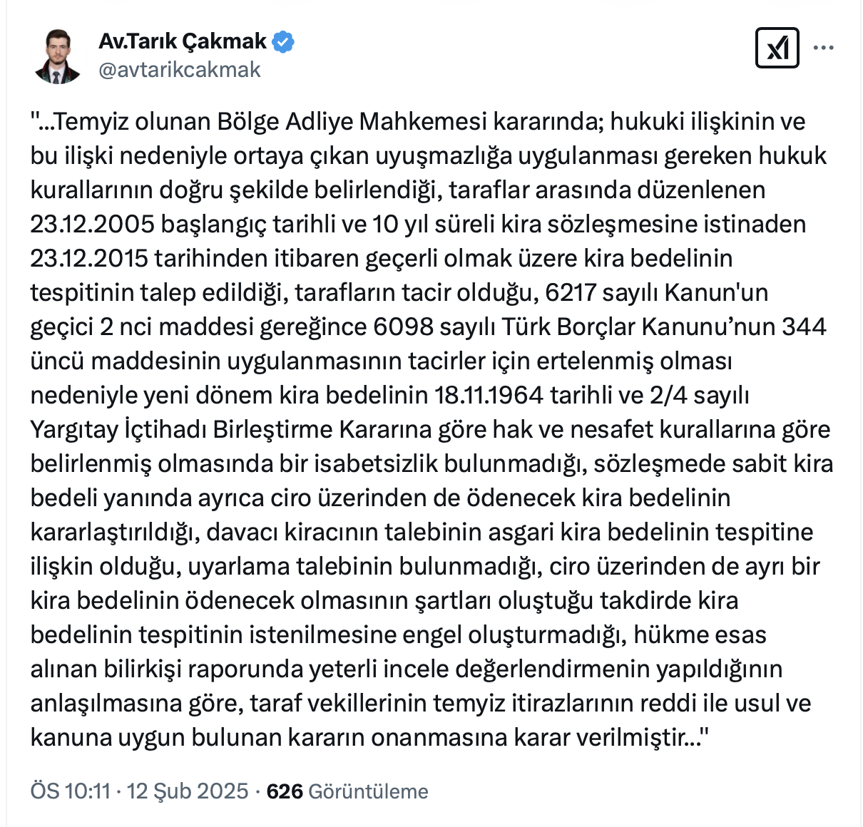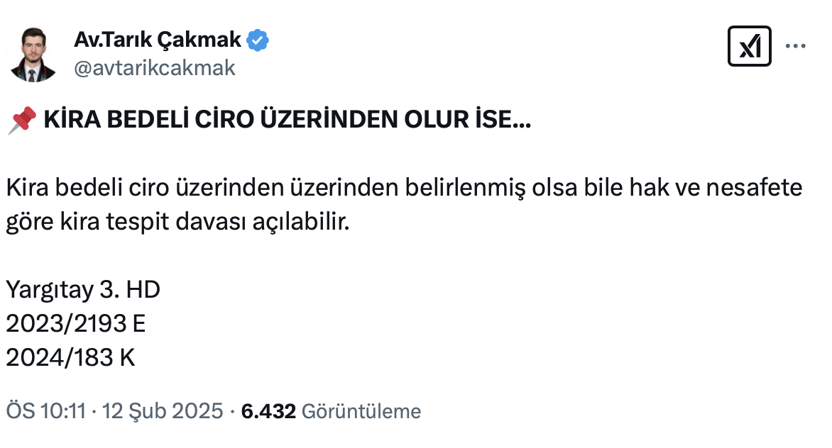 Avukat Tarık Çakmak resmi X hesabı https://x.com/avtarikcakmak üzerinden yaptığı paylaşımda kira bedeli ciro üzerinden üzerinden belirlenmiş olsa bile hak ve nesafete göre kira tespit davası açılabileceğini belirtti.