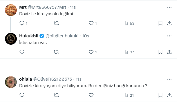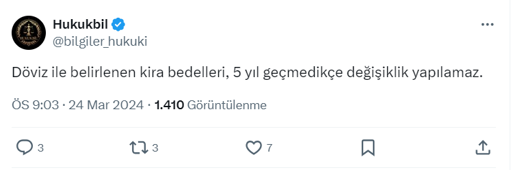 Sosyal medya üzerinden yaptığı paylaşımlarla dikkat çeken 8 bin 203 takipçili Hukukbil isimli kullanıcı resmi sosyal medya hesabı https://twitter.com/bilgiler_hukuki üzerinden yaptığı paylaşımlarla dikkat çeken Hukukbil de kira bedelini dövizle belirleyenler için önemli bir uyarı yaptı.
