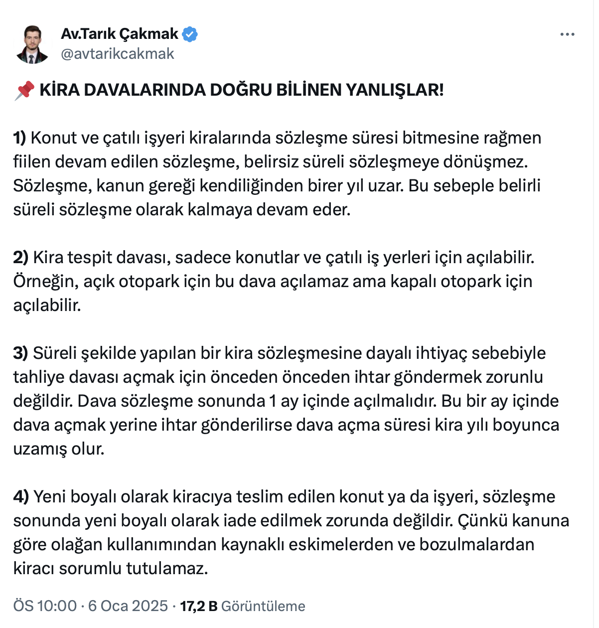 Avukat Tarık Çakmak resmi X hesabı https://x.com/avtarikcakmak üzerinden yaptığı paylaşımda kira davalarında doğru bilinen 4 yanlışı açıkladı.