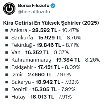 Borsa Filozofu sosyal medya hesabı X'ten açıkladı. İşte en çok kira getirisi olan iller...