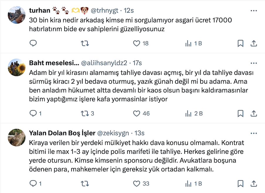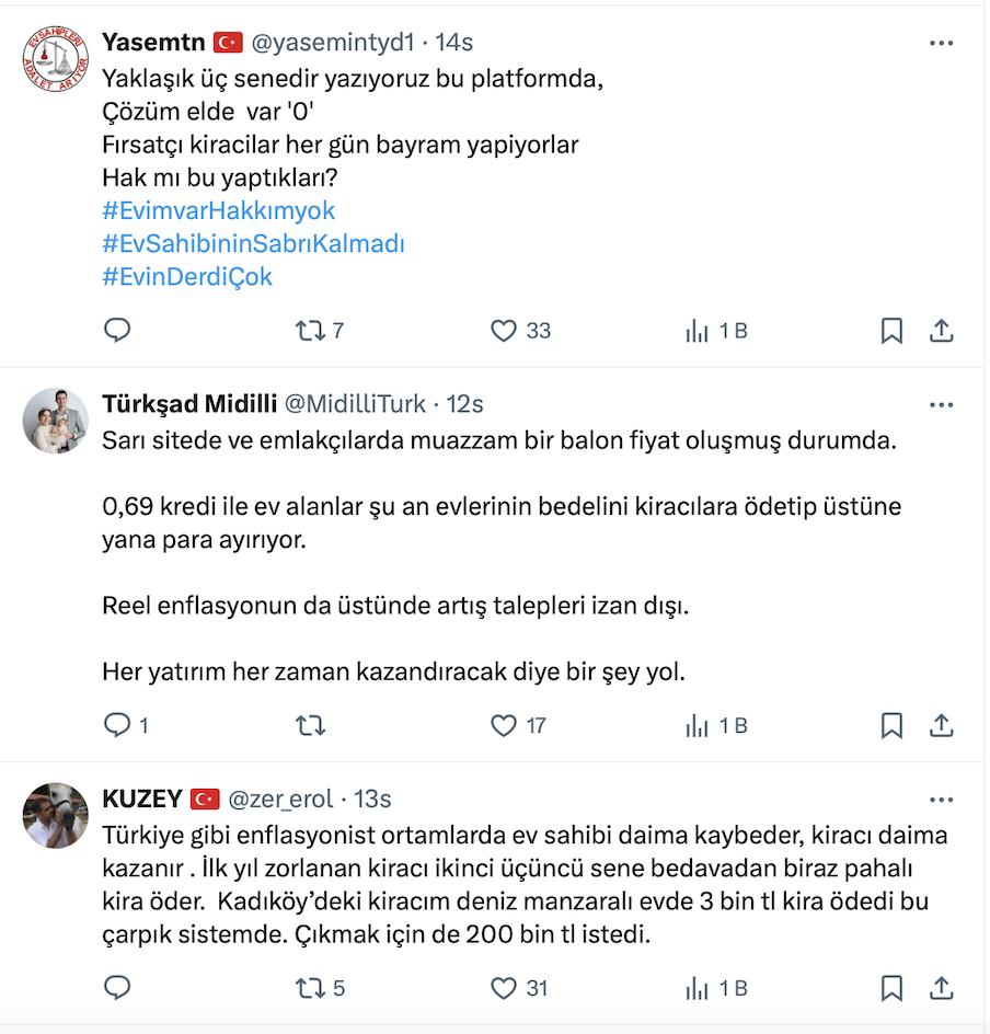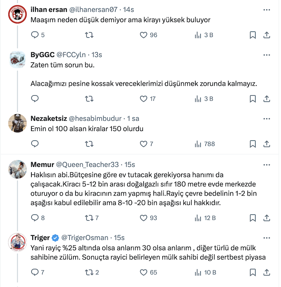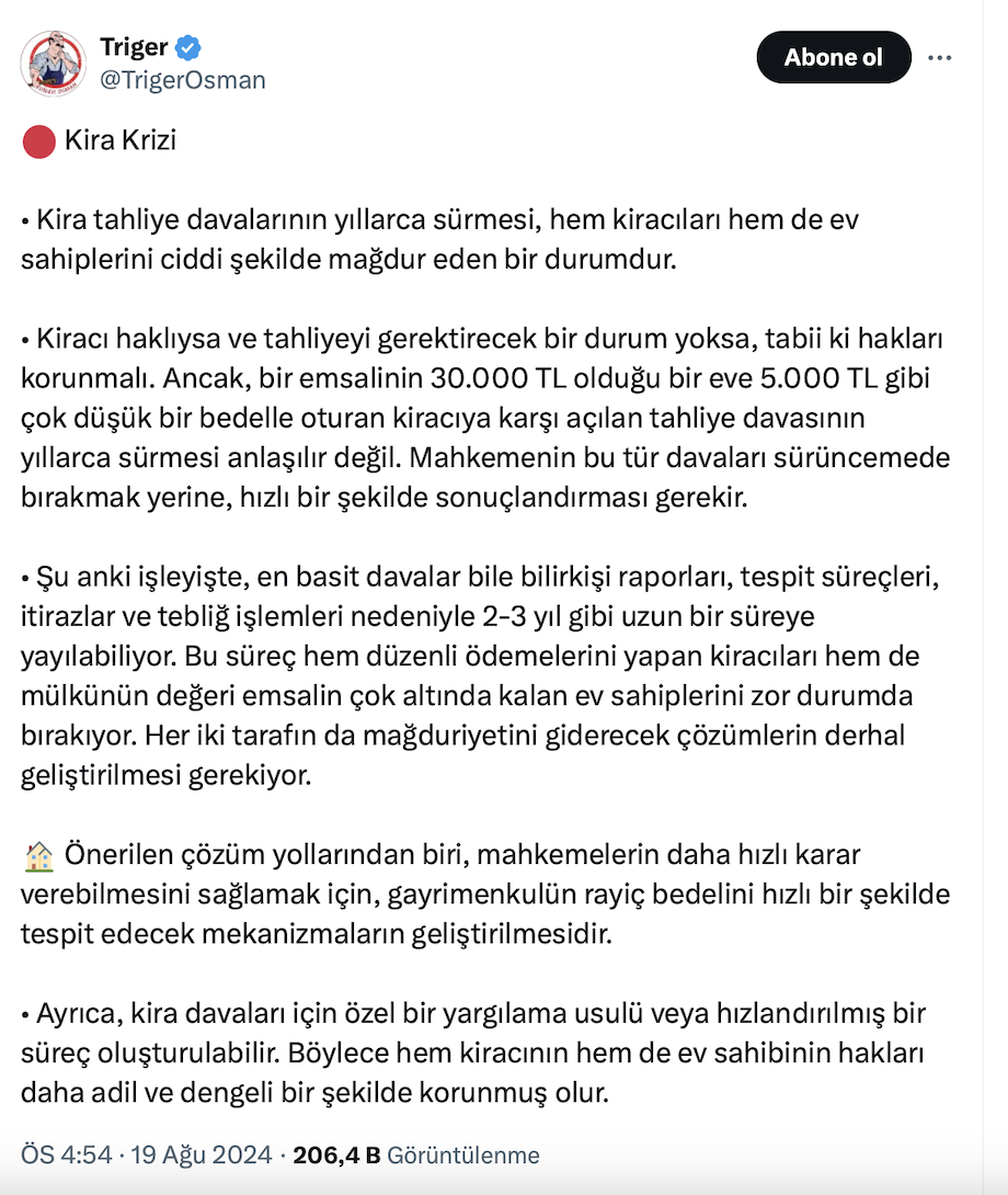 Ev sahipleri ve kiracılar arasında sular durulmazken son günlerin en çok konuşulan konuları arasında yer alan kira krizinin nasıl çözüleceği de pek çok kişi tarafından merak ediliyor. İşte 154.5 bin takipçili Triger Osman isimli kullanıcının X sosyal medya hesabından yaptığı kira krizi paylaşım...