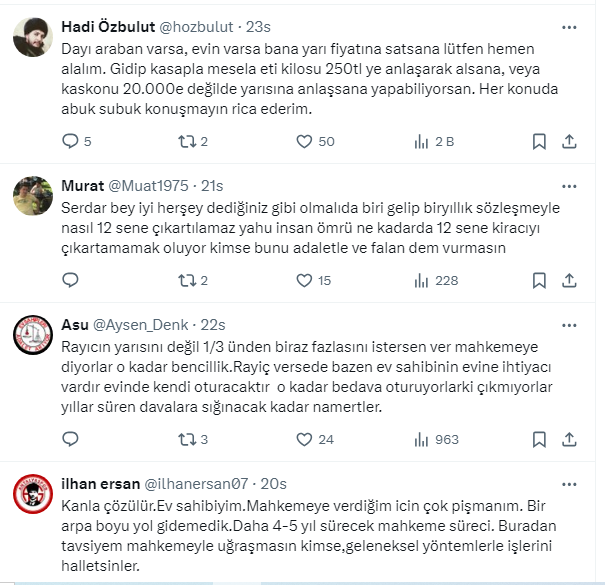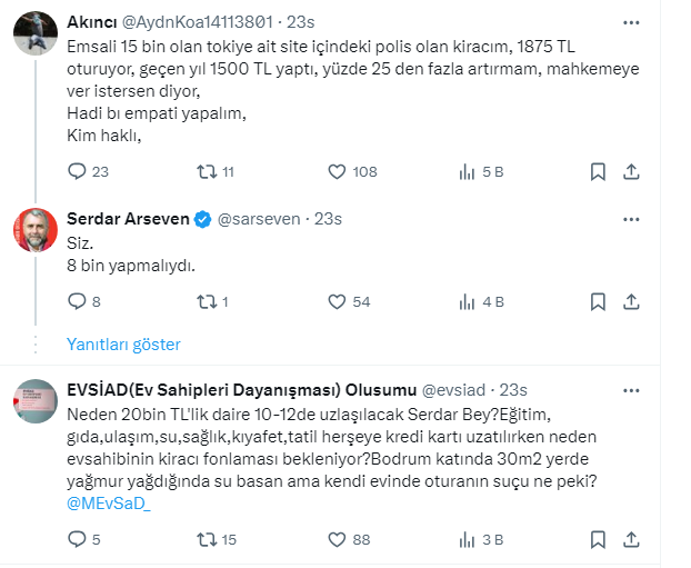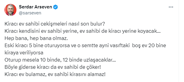 Ev sahipleri sosyal medya hesaplarından seslerini duyurmaya çalışırken, Gazeteci, yazar Serdar Arseven’den ev sahiplerini kızdıran bir paylaşım geldi. Serdar Arseven, https://x.com/sarseven resmi X sosyal medya hebabından yaptığı paylaşımda şu öneride bulundu. Arseven'in önerisi ev sahiplerini isyan ettirirken, "Evin araban varsa bana yarı fiyatına satsana" tepkileri geldi.