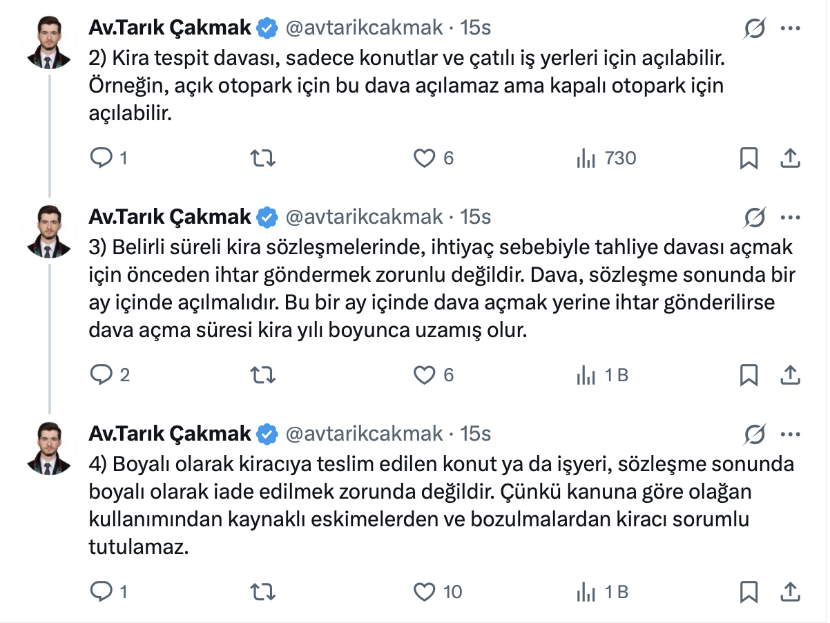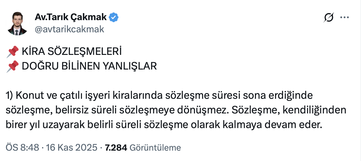 Tarık Çakmak, resmi X hesabı https://x.com/avtarikcakmak üzerinden yaptığı paylaşımda kira sözleşmelerinde doğru bilinen yanlışları açıkladı.