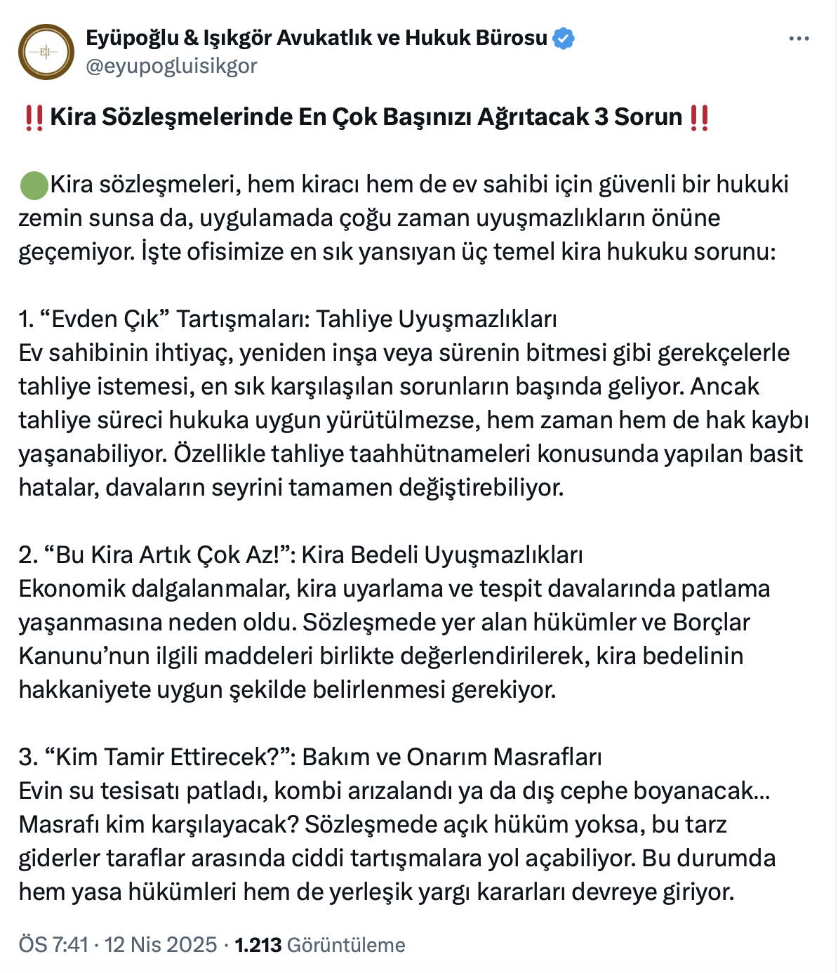 Eyüpoğlu - Işıkgör Avukatlık ve Hukuk Bürosu resmi sosyal medya hesabı https://x.com/eyupogluisikgor üzerinden yaptığı paylaşımda kira sözleşmelerinde en çok başınızı ağrıtacak 3 sorun da açıkladı.