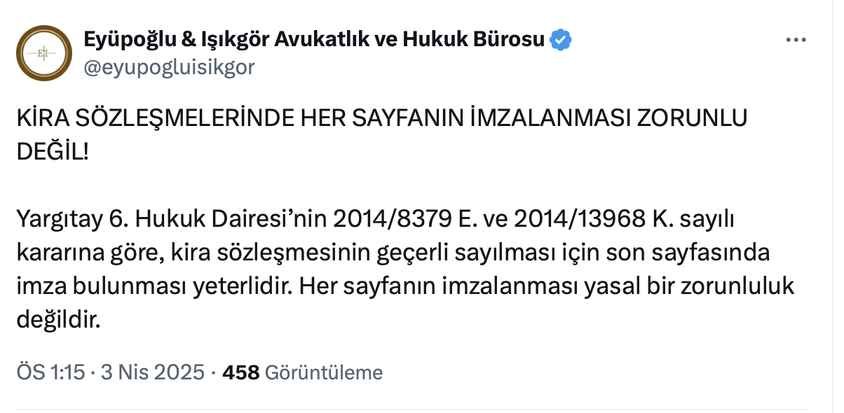 Eyüpoğlu - Işıkgör Avukatlık ve Hukuk Bürosu resmi sosyal medya hesabı https://x.com/eyupogluisikgor üzerinden yaptığı paylaşımda “Kira sözleşmelerinde her sayfanın imzalanması zorunlu mu?” Sorusuna yanıt verdi.