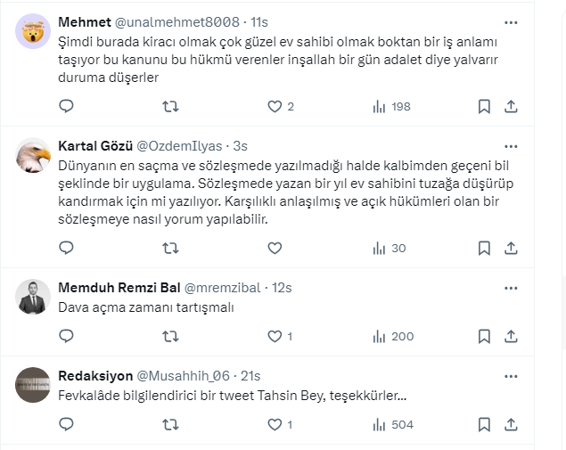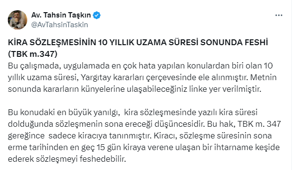 Ev sahibi –kiracı tartışmaları sürerken, Avukat Tahsin Taşkın, https://x.com/AvTahsinTaskin sosyal medya hesabından yaptığı paylaşımda, kira sözleşmesinin 10 yıllık uzama süresi sonunda feshiyle ilgili bilinmesi gerekenleri dava örnekleri ve Yargıtay kararlarıyla anlattı.