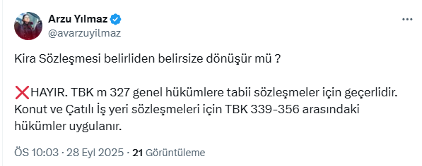 Peki belirli kira sözleşmesi belirsize çevrilir mi? Avukat Arzu Yılmaz sosyal medya hesabından açıkladı. Yılmaz, kira sözleşmesinin belirliden belirsize çevrilmeyeceğini söyleyerek Türk Borçlar Kanunu'ndaki ilgili maddeyi açıkladı.