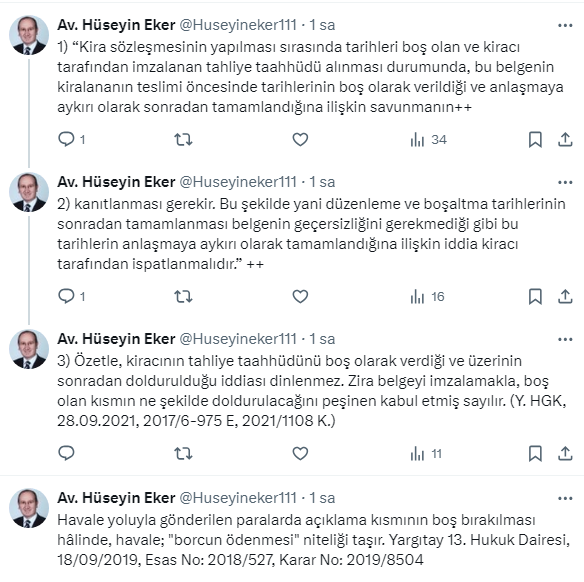 Konuyla ilgili Avukat Hüseyin Eker, sosyal medya hesabından kira sözleşmesinin yapılması sırasında tarihleri boş olan ve kiracı tarafından imzalanan tahliye taahhüdü alınması durumunda nelerin olacağını açıklandı. İşte Eker'in o açıklaması...