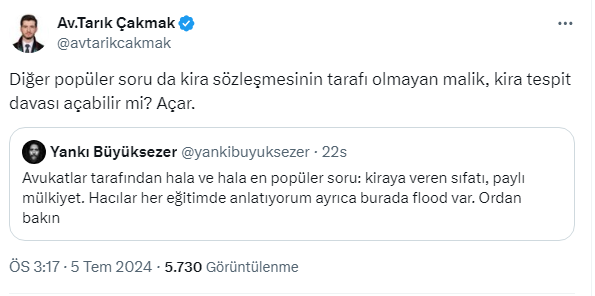 Peki Kira sözleşmesinin tarafı olmayan malik, kira tespit davası açabilir mi? Avukat Tarık Çakmak, milyonlarca kişinin merak ettiği bu sorunun yanıtını sosyal medya hesabı X'ten açıkladı. İşte cevabı...