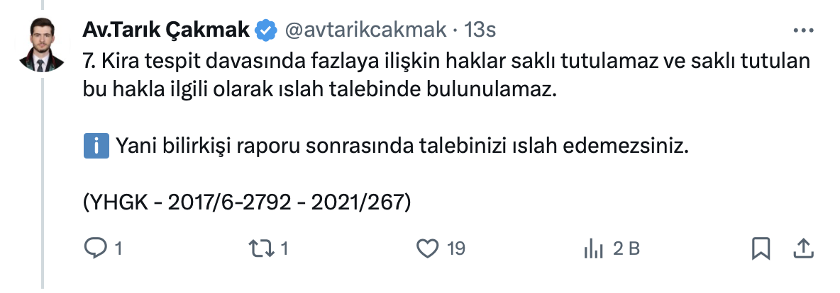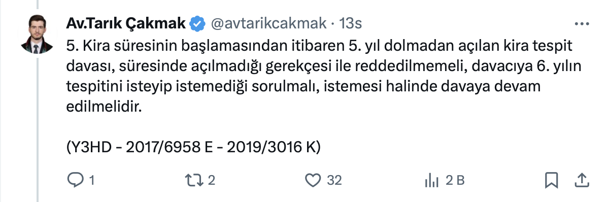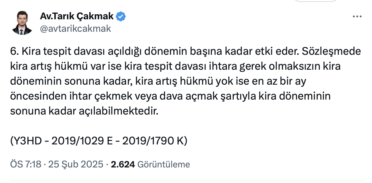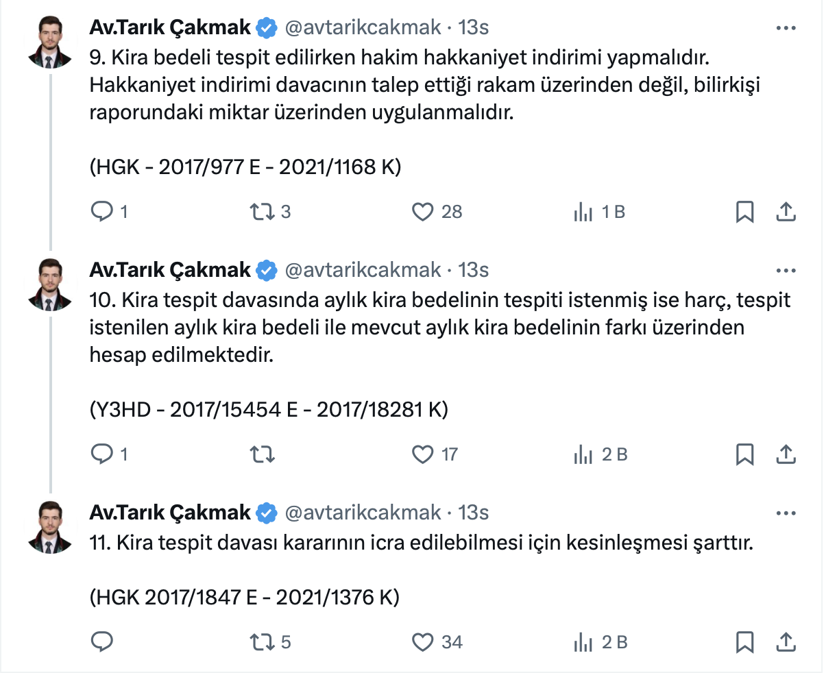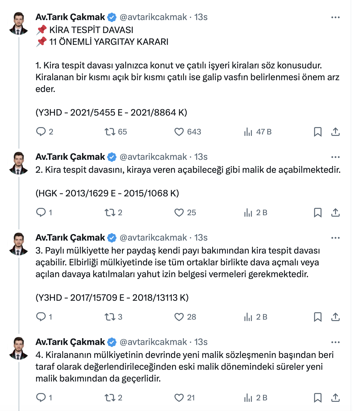 Avukat Tarık Çakmak resmi X hesabı https://x.com/avtarikcakmak üzerinden kira tespit davası ile ilgili 11 önemli yargıtay kararını paylaştı.