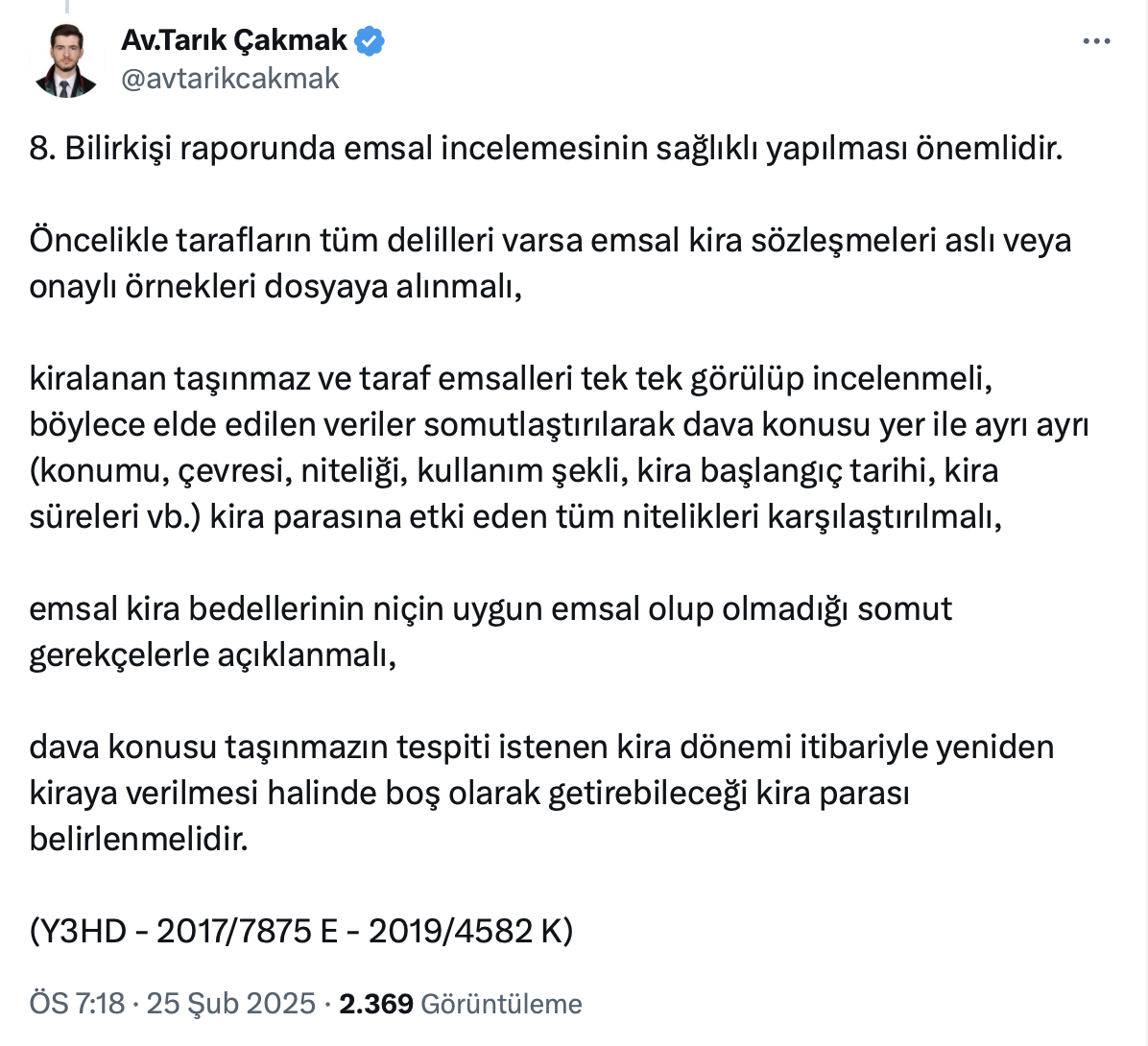8. Bilirkişi raporunda emsal incelemesinin sağlıklı yapılması önemlidir.