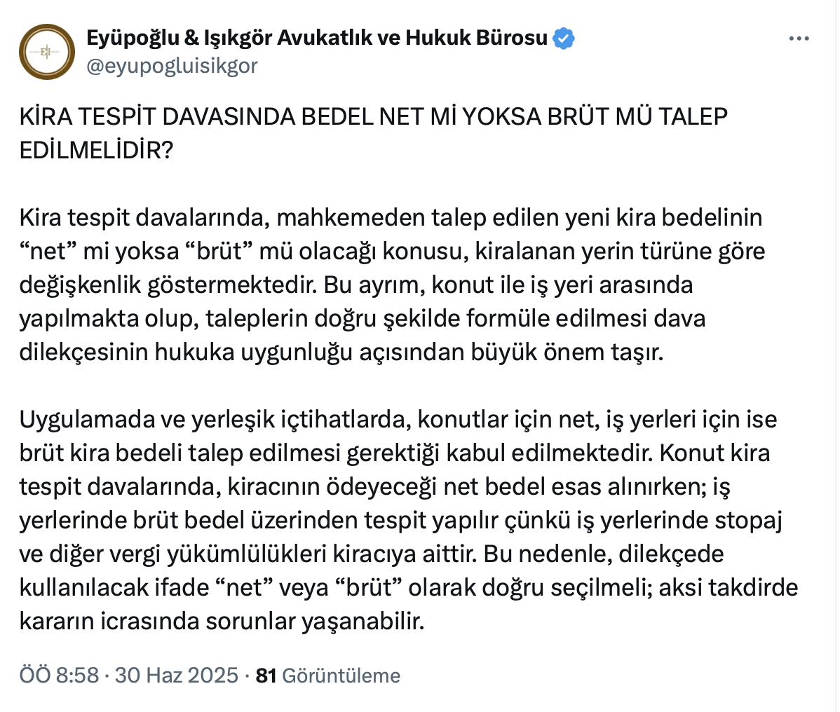 Eyüpoğlu - Işıkgör Avukatlık ve Hukuk Bürosu resmi sosyal medya hesabı https://x.com/eyupogluisikgor üzerinden yaptığı paylaşımda “Kira tespit davasında bedel net mi yoksa brüt mü talep edilmelidir?” sorusuna yanıt verdi.