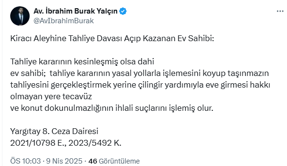 Av. İbrahim Burak Yalçın, sosyal medya hesabından, kiracı aleyhine tahliye avası açıp kazanna ev sahibinin yapmaması gerekenleri Yargıtay kararı ile açıkladı. İşte o paylaşım...