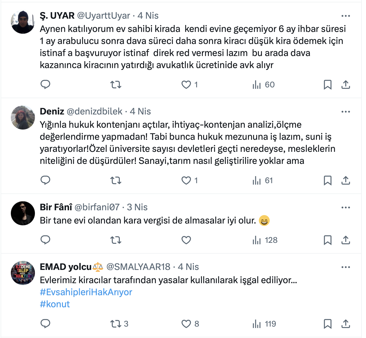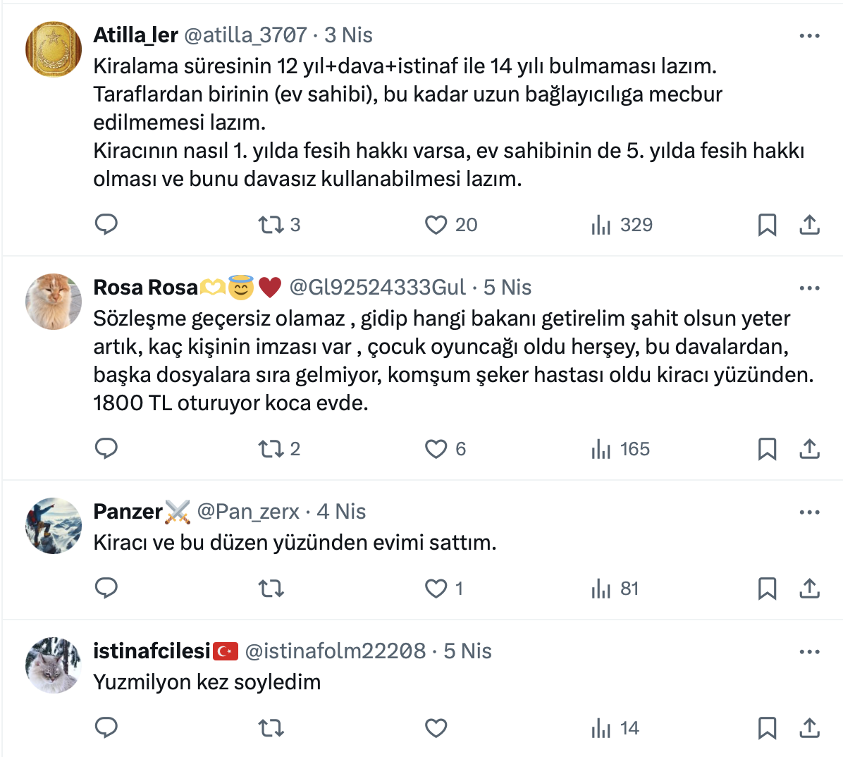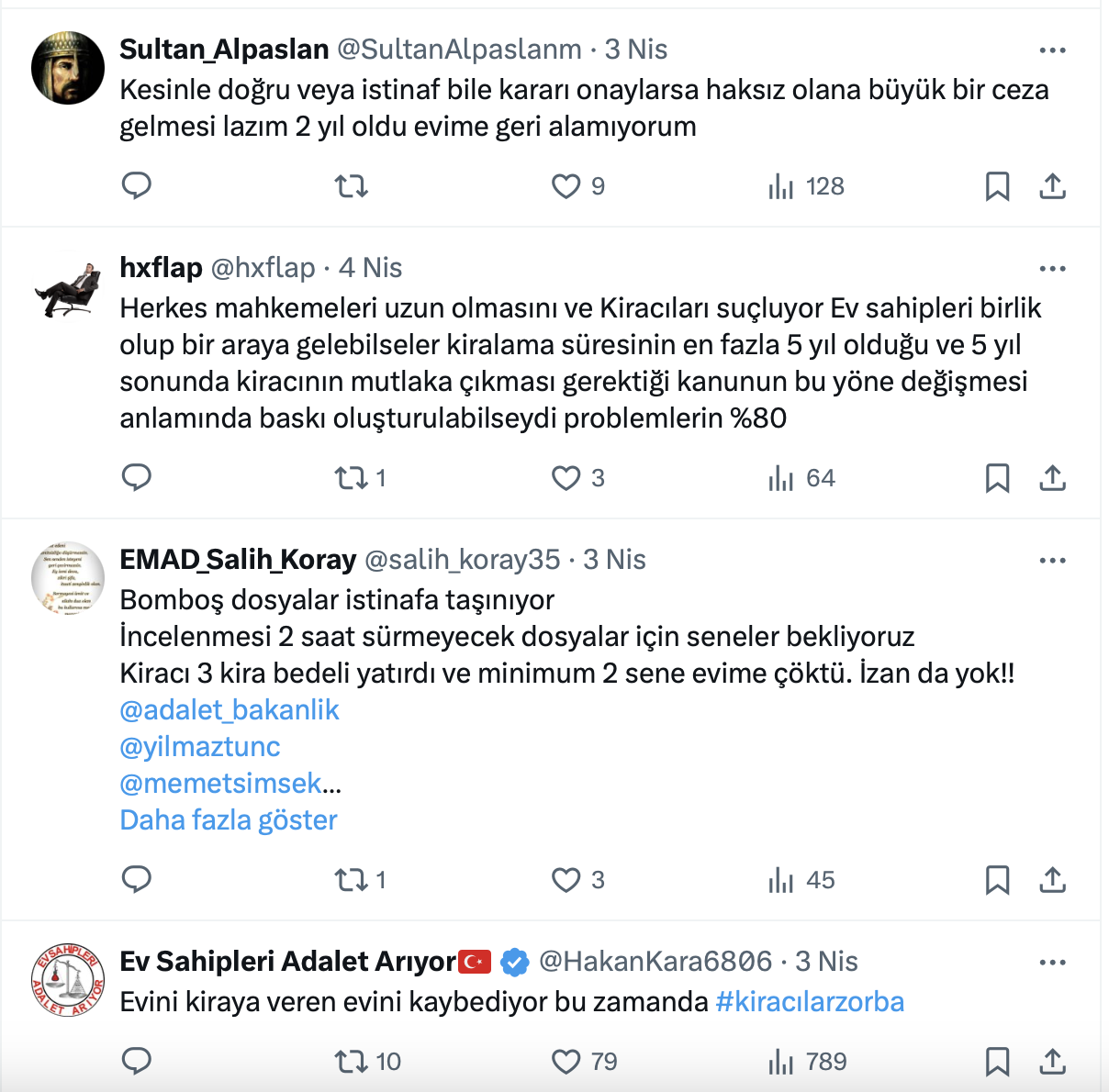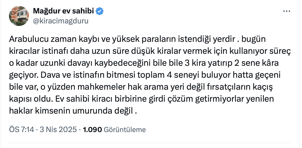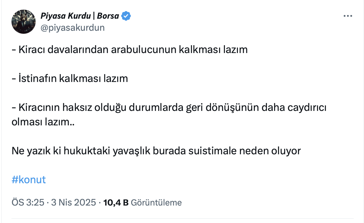 Piyasa Kurdu paylaşımında şu ifadeleri kullandı: “ İstinafın kalkması lazım. Kiracının haksız olduğu durumlarda geri dönüşünün daha caydırıcı olması lazım.