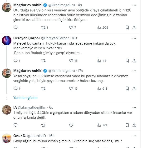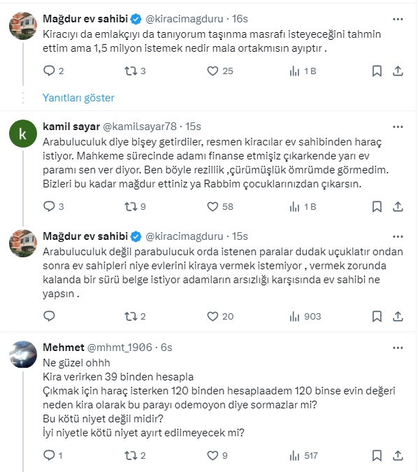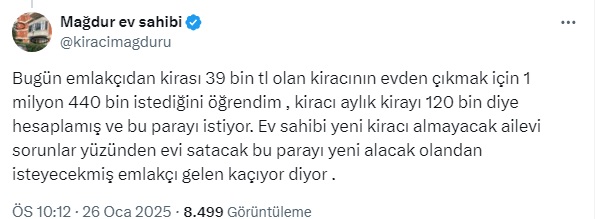 Bugün emlakçıdan kirası 39 bin TL olan kiracının evden çıkmak için 1 milyon 440 bin TL istediğini öğrendim , kiracı aylık kirayı 120 bin diye hesaplamış ve bu parayı istiyor. Ev sahibi yeni kiracı almayacak ailevi sorunlar yüzünden evi satacak bu parayı yeni alacak olandan isteyecekmiş emlakçı gelen kaçıyor diyor .
