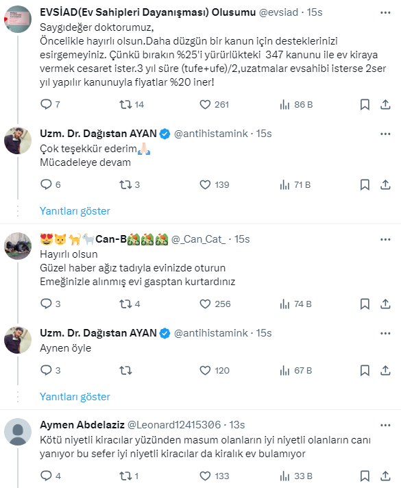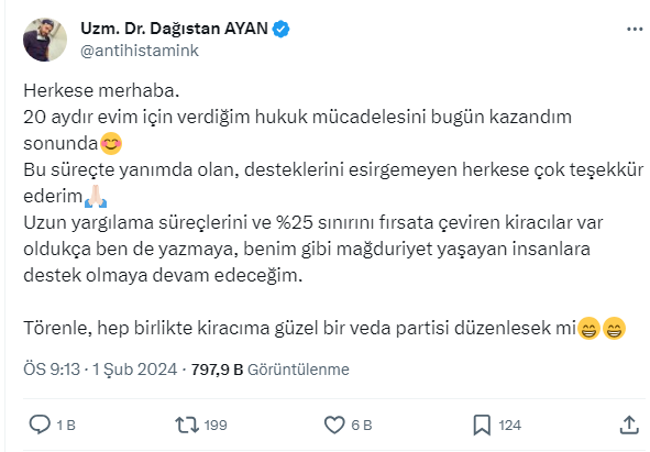 Ev sahibi ve kiracı sorunları son zamanlarda ülke genelinde gündemde yer alıyor. Hemen hemen her gün farklı illerden gelen kiracı ve ev sahibi sorunları gittikçe büyüyor. Yüzde 25 kira sınırlamasını fırsata çeviren bazı kriacılar ev sahiplerie zor günler yaşatmaya başladı. Bir örneği de Uzman Doktor Dağıstan Ayan'ın başına geldi. 20 aydır kiracısı ile sıkıntıları olan ünlü doktor Dağıstan kiracısıyla olan davasını bugün kazandı. Yüzde 25 kira sınırını fıraata çeviren kiracısı ile uzun zamandır sorunlar yaşan Dağıstan sosyal medyadan sık sık gelişmeleri paylaşmıştı. Bugün paylaştığı son paylaşımda takipçilerine mutlu haberi verdi. ''20 aydır evim için verdiğim hukuk mücadelesini bugün kazandım sonunda'' diyen Dağıstan, uzun yargılama süreçlerini ve yüzde 25 sınırını fırsata çeviren kiracılar var oldukça yazmaya ve mağdur olan ev sahiplerin destek olmaya devam edeceğini açıkladı. Dağıstan'ın o paylaşımını altın adeta yorum yağmuru yağdı. İşte o paylaşım ve gelen yorumlar...