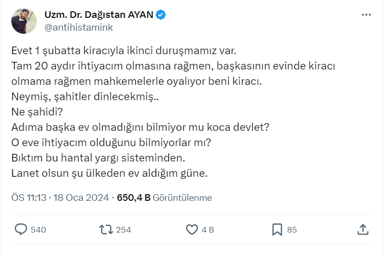 Uzman Doktor Dağıstan Ayan da resmi X hesabı https://twitter.com/antihistamink üzerinden sık sık kiracısı ile yaşadığı sorunlara ilişkin paylaşımlar yapıyor.
