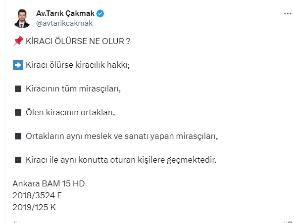 Avukat Tarık Çakmak, X sosyal medya hesabından kiracının ölmesi durumunda haklarının kime geçeceğini maddeler halinde açıkladı. Peki kiracı ölürse ne olur, kiracılık hakkı kime geçer?