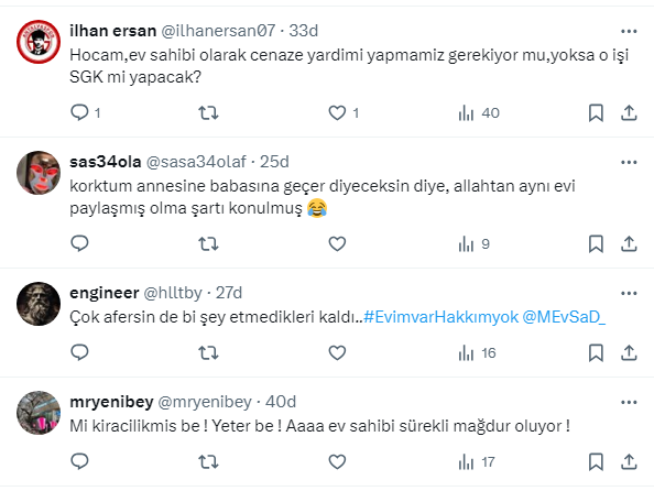 Ev sahibi ile kiracılar bir takım haklara sahip. Ev sahiplerinin hakları olduğu kadar kiracıların da birden fazla hakkı bulunuyor. En çok merak edilen ve araştırılanlardan biri de ''kiracı ölürse ne olur, hakkı kime geçer?'' Avukat Tarık Çakmak, X sosyal medya hesabından kiracının ölmesi durumunda haklarının kime geçeceğini maddeler halinde açıkladı. İşte o paylaşım ve takipçilerden gelen yorumlar...