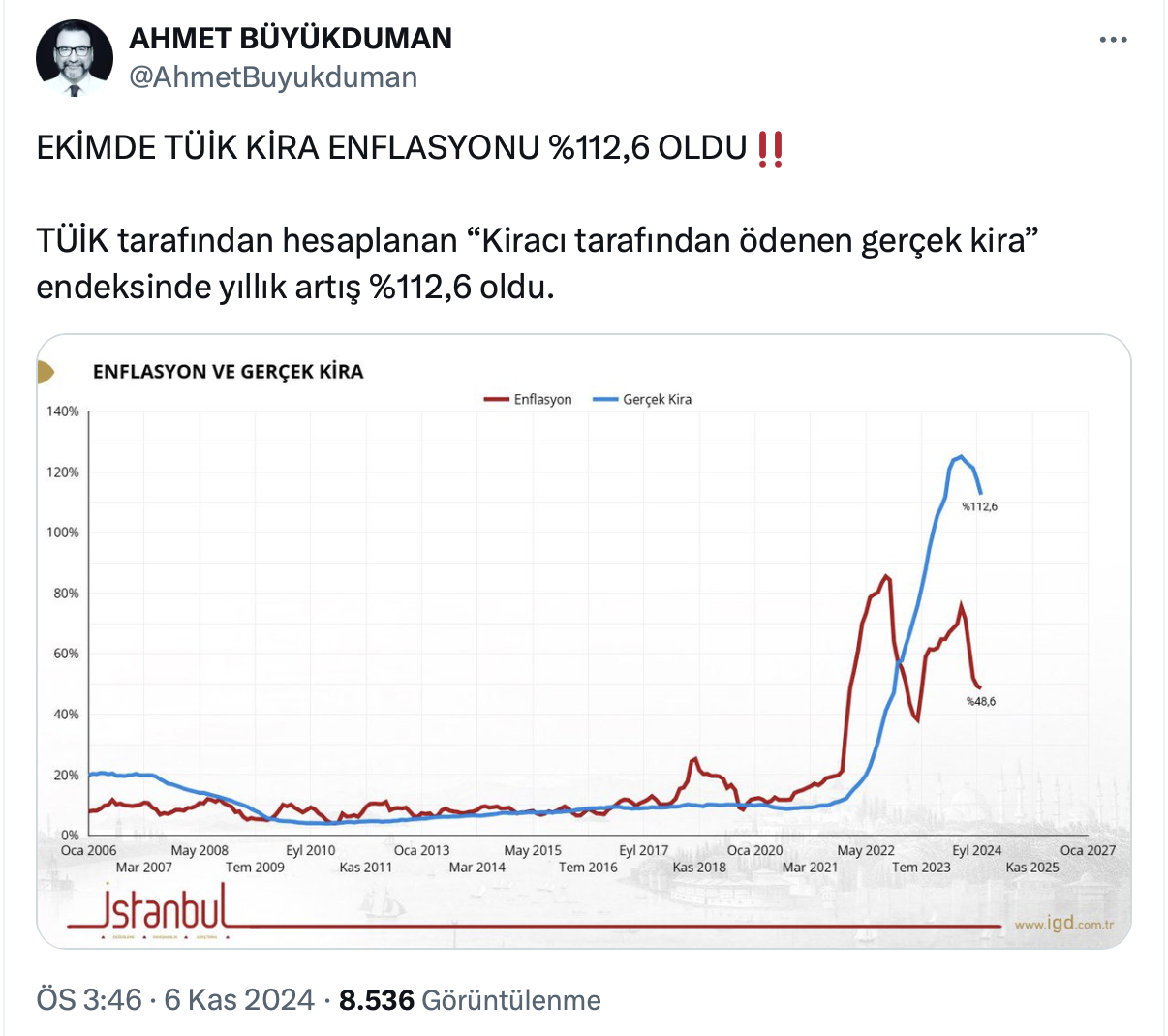 Ahmet Büyükduman yaptığı paylaşımda TÜİK tarafından hesaplanan “Kiracı tarafından ödenen gerçek kira” endeksinde yıllık artışın yüzde 112,6 olduğunu söyledi.