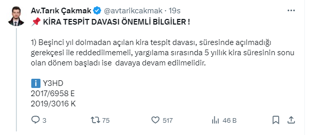 Avukat Tarık Çakmak sosyal medya hesabından kira tespit davasında dikkat edilmesi gereken 11 maddeyi açıkladı. Kiracı ve ev sahiplerini yakından ilgilendiriyor. İşte ayrıntılar...