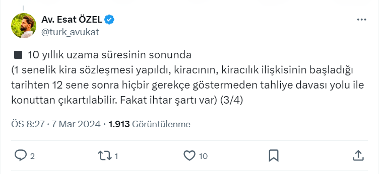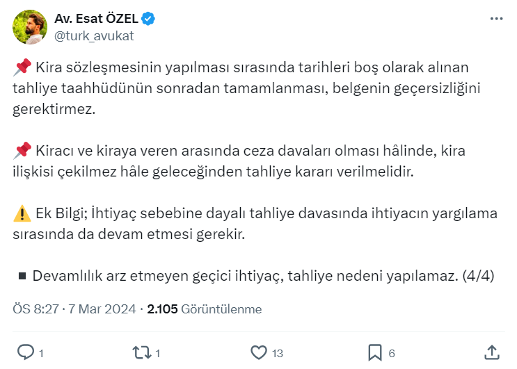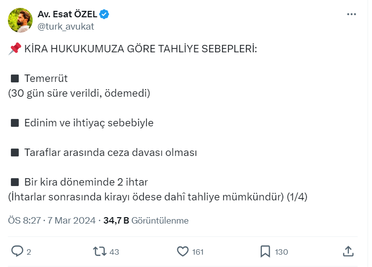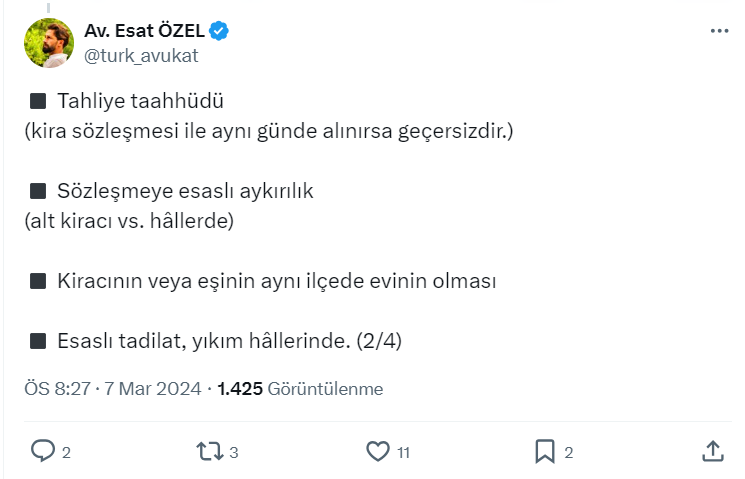 Ev sahibi kiracı paylaşımlarıyla dikkat çeken Avukat Esat Özel resmi X hesabı https://twitter.com/turk_avukat üzerinden kira hukukuna göre tahliye sebeplerini paylaştı.