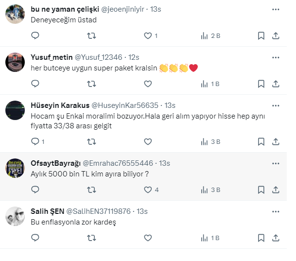 Hüseyin Karakus @HuseyinKar56635: ''Hocam şu Enkai moralimi bozuyor.Hala geri alım yapıyor hisse hep aynı fiyatta 33/38 arası gelgit''