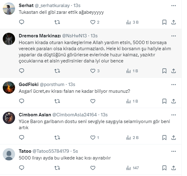Dremora Markinazı @NsHwN13: ''Hocam kirada oturan kardeşlerime Allah yardım etsin, 5000 tl borsaya verecek paraları olsa kirada oturmazlardı. Hele ki borsanın şu haliyle alım yaparlar da düştüğünü görürlerse evlerinde huzur kalmaz, yazıktır çocuklarına et alsin yedirsinler daha iyi olur bence.''