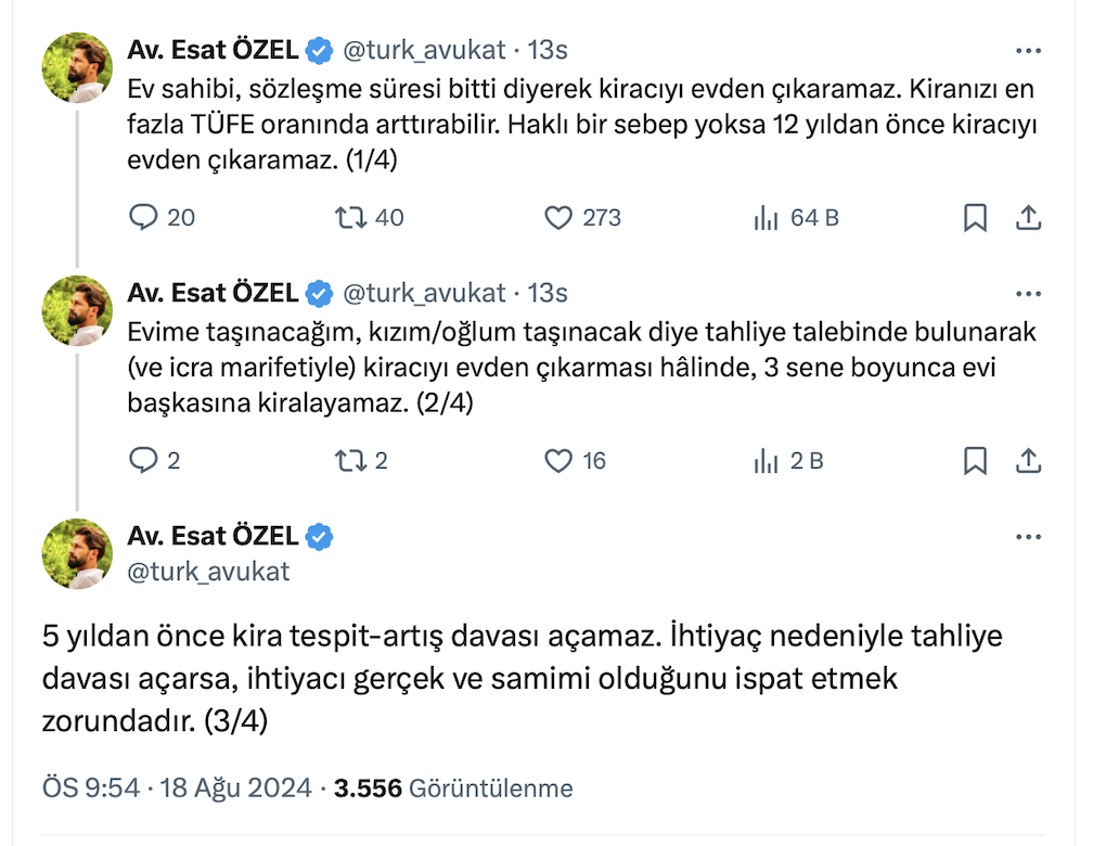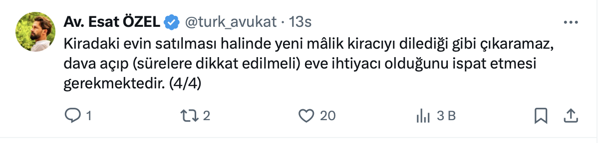 Mülk sahipleri ve kiracıları yakından ilgilendiren konular ile ilgili olarak yaptığı paylaşımlarla dikkat çeken Avukat Esat Özel resmi X hesabı https://twitter.com/turk_avukat üzerinden yine çok önemli bir paylaşım yaptı.