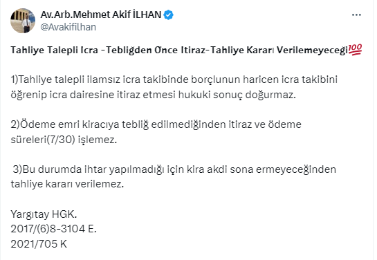 Avukat –Arabulucu Mehmet Akif İlhan https://x.com/Avakifilhan ev sahibi ve kiracılar açısından büyük önem taşıyan tahliye talepli ilamsız icra takibiyle ilgili bilgi vererek Yargıtay kararlarını duyurdu.