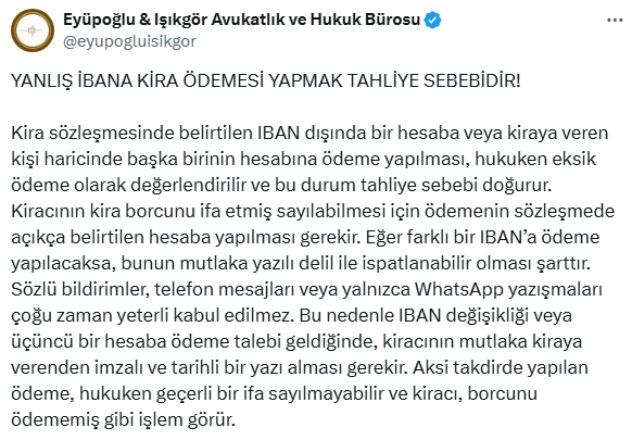 Eyüpoğlu & Işıkgör Avukatlık ve Hukuk Bürosu sosyal medya hesabından kiracıları 'yanlış ibana kira atmayın' uyarısında bulundu.