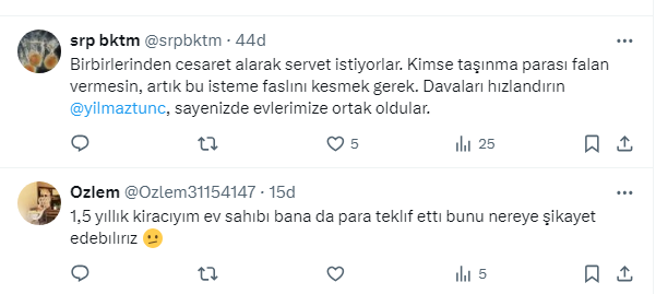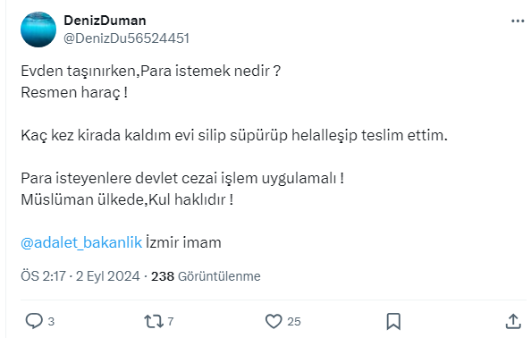 Mağdur ev sahibi Deniz Duman konuyla ilgili sosyal medya hesabı X'ten isyan etti. Duman, 'evden taşınırken para istemek nedir?' diye sordu. Bunun resmen haraç olduğunu söyleyen duman, taşınma parası isteyen kiracılara devletin cezai işlem uygulaması gerektiğini söyledi. İşte Deniz Duman'ın sosyal medya hesabı x'ten yaptığı o paylaşım ve gelen yorumlar...