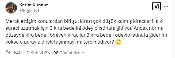 Merak ettiğim konulardan biri şu; kirası çok düşük kalmış kiracılar illa ki süreci uzatmak için 3 kira bedelini ödeyip istinafa gidiyor. Ancak normal düzeyde kira bedeli ödeyen kiracılar 3 kira bedeli ödeyip istinafa gider mi yoksa o parayla direk taşınmayı mı tercih ediyor?